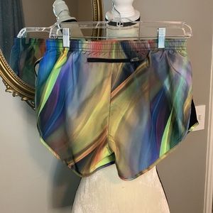 Nike running shorts. Size small. Multi colored. EUC. Measurements provided. These do have a liner inside and a drawstring inside waistband. Any questions, just ask!