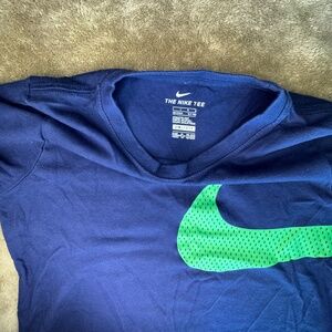 Nike short sleeve shirt in blue color with green logo size 7 Large. In good condition no wear and tear