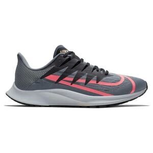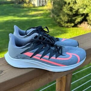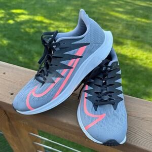 Nike brand, Zoom Rival Fly style, running shoes, athletic sneakers, shoe is primarily gray with neon coral pink Nike swoosh logo accents and black zig zag design and laces, women's size 9, excellent pre-owned condition