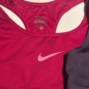 Pair of Nike Dri-FIT sports bras. Includes magenta and dark purple.