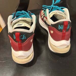 Vibrant Nike sneakers for kids. Red and green accents with white details. Ideal for active days.