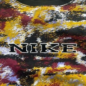 Stay cozy while making a bold statement in this eye-catching Nike crewneck sweatshirt. It features an allover abstract brushstroke print in shades of burgundy, mustard, black, and lavender — plus both a front and back Nike logo for that signature sporty touch. Soft fleece interior keeps you warm and comfy, while ribbed cuffs and hem give it structure and shape.