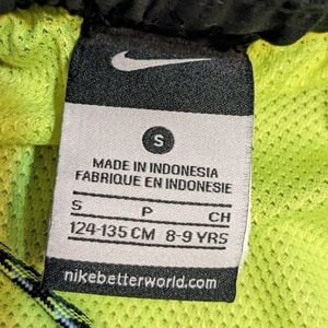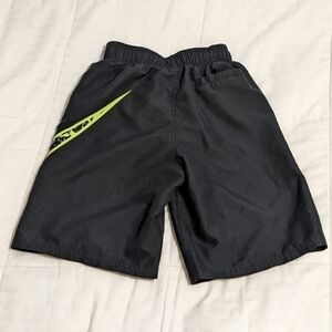 black Nike swim shorts in excellent condition size small. there is an interior bathing suit liner. waistband is nice and sturdy and there are two interior ties if you want to make the waste smaller. it has the classic nice Nike swoosh on the front. there is a velcro back pocket. the waist measures 10 in, the rise measures 9 1/2 inches, and the NC measures 8 in these are in like new conditions