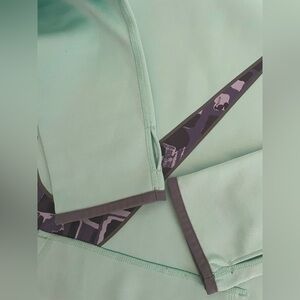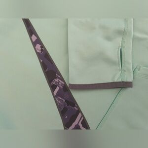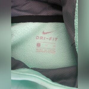 This dri fit hoodie is in excellent used condition. It has a cozy, drawstring free funnel neck, and thumbholes. It’s a very striking aqua or teal blue. With gray logos and accents.