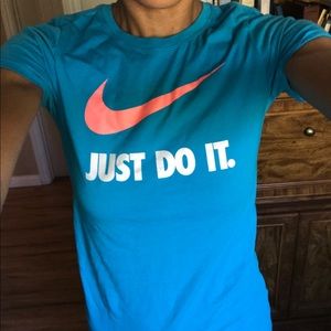 Beautiful blue Nike tee, with nice pink accent Nike check. Fitted. Great for working out in or just wearing casually with a pair of jeans.
