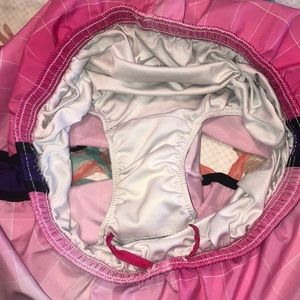 Pink block pattern with varying shades of pink. Purple mesh panels on sides. Inner lining. Drawstring. Worn 1-3 times. Second picture shows very light stain that I haven’t tried to remove