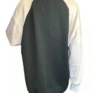 a small stain on the sleeve and a white stain on the back of the sweatshirt pictures are provided.