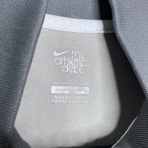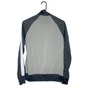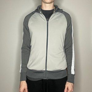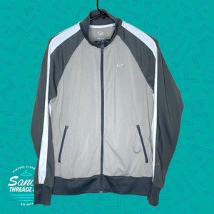 Nike full zip Grey track jacket. Size Large. Model is 5'9. Great condition and quality. Super sick Grey and white colorway. Features 2 front zipper pockets, front Nike logo, full zip closure, side striping, and elastic cuffs and hem. Classic Nike jacket. FREE SHIPPING