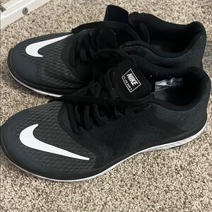 These Nike athletic shoes feature a sleek black and white design, highlighted by the iconic white swoosh logo. Crafted for performance, they offer a comfortable fit with mesh uppers and durable rubber soles. Ideal for both sports and casual wear, these shoes combine style and functionality seamlessly.