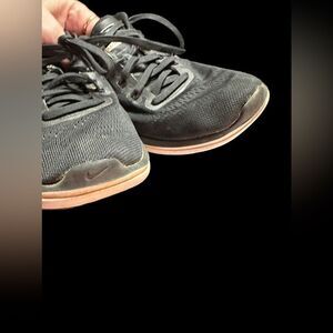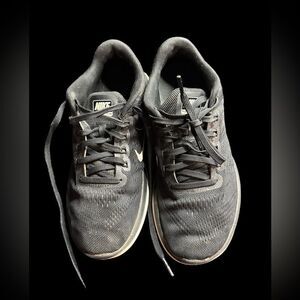 Nike women’s Flex Run size 7M black with white trim pre-owned cond very light, cool, and comfortable! Knit upper with Lightweight cushioning at the heel. Flex grooves in the outsole move naturally with your foot, from heel to toe. Less foam in the outsole allows for better flexibility and a light weight. These pics makes them look more worn than they are…I’ve tried different lighting and backgrounds 🤷♀️ They’re not faded but do have some normal wear.