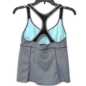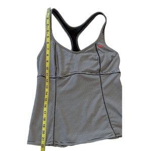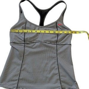 Featuring a gorgeous black and white striped pattern, this racer back tank is comfortable and lightweight, perfect for any workout.