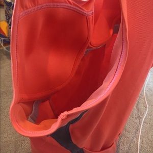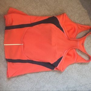 Great workout top with a built in bra. Used but still in good condition. Orange color with grey details. The back has a breathable fabric to it, but overall is a very durable material. Would fit best on a B cup in my opinion but could work for an A or C as well.