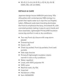 Ideal for casual occasions and winter weather, this jacket is perfect for any Lakers fan. It is available in M/L size, and its outer shell material is made of nylon, while the lining is made of nylon. The jacket is new with tags and does not have any damage or wear. Get your hands on this Nike X Ambush Los Angeles Lakers water-repellent coat jacket now.