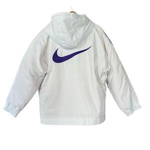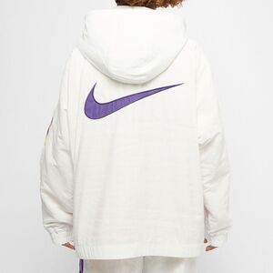 Show off your love for the Los Angeles Lakers and the late Kobe Bryant with this Nike X Ambush puffer jacket. The white, purple, and gold color scheme matches the Lakers' team colors, and the Lakers basketball logo adds a stylish touch. This mid-length jacket is made of softshell fabric and features a full zip and snap closure, hood, and zippered accents.