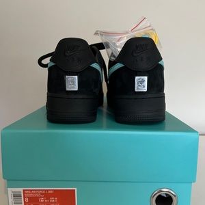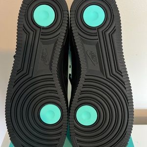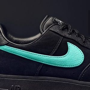 The Nike/Tiffany Air Force 1 1837 is crafted in premium black suede with a Tiffany Blue® Swoosh and archival Tiffany logo on the tongue. A foam midsole, rubber outsole and Tiffany Blue®-accented pivot points define the shoe, which comes with black rope laces as well as three pairs of flat laces in Tiffany Blue®, yellow and white. All Nike/Tiffany Air Force 1 1837 shoes arrive in a co-branded Tiffany Blue® box.