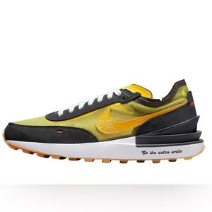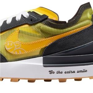 Nike x Undercover Daybreak sneakers in the “Bright Citron” colorway, size 13. Features yellow mesh upper, black suede trim, and yellow Swoosh with smiley/peace graphic. “Go the extra mile” printed on midsole. Designed by Jun Takahashi of Undercover. These iconic collab runners have a deconstructed look and a lightweight feel.