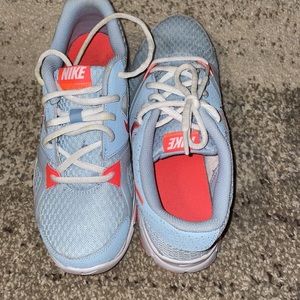 Gently worn Nikes light blue with fluorescent orange accents. Only wore them a couple times. Youth size 6