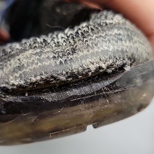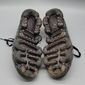 These Vapormax are well worn. The size tag is worn off but measures out to be a size 10. The air bubbles are scuffed but not popped. The toe is worn through. The blue accent stitching is loose. However, these are the hard to find Vapormax. Always a stand out shoe.
