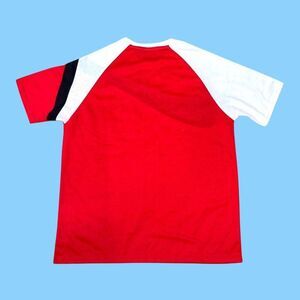 Elevate your casual style with this Nike T-shirt, featuring a bold black swoosh on a vivid red and white design. Comfortable cotton-polyester blend ensures durability and breathability, making it a wardrobe staple.