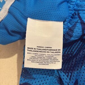 Vibrant blue shorts with dynamic patterns. Comfortable and sporty design. Features drawstring waist.