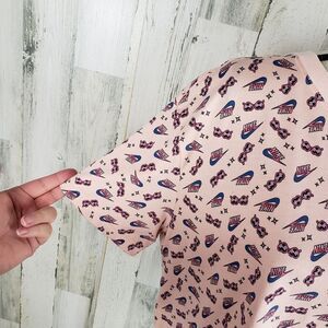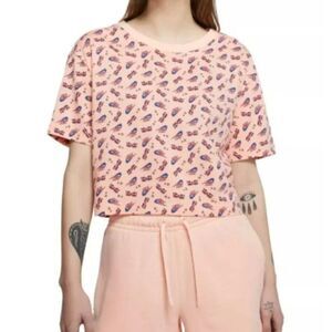 ~ Description: Pink and blue tee with Nike logo and sunglasses graphics, cropped length, short sleeves, crew neck, stretchy knit material