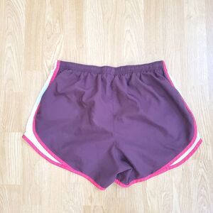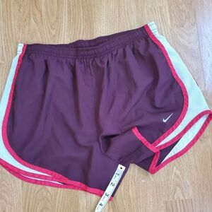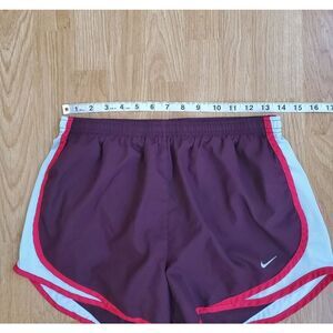 Nike athletic shorts in brown with red trim and gray mesh accent. Ideal for workouts and running.