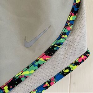 These awesome shorts are in excellent pre-owned condition. They are gray with a really cool neon spatter pattern trim. They have the interior liner and a drawstring on the elastic waistband as well.