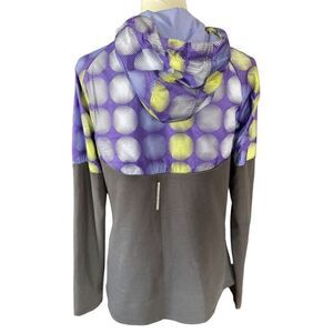 Looking for a great running jacket to exercise in? Or just wear it for the style! This Purple with Neon Yellow Circular design on top makes you stand out with reflectors and gray bottom Nike DriFit Running Jacket Size Large is just for you!