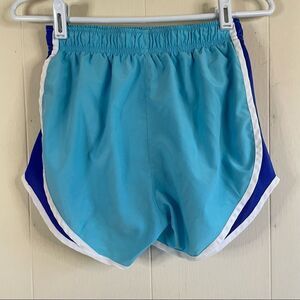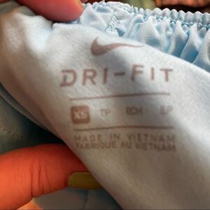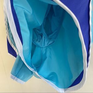 These shorts are in excellent pre-owned condition. They are very simple in shades of blue, and white. The liner is in tact as well. The elastic waistband has a drawstring.