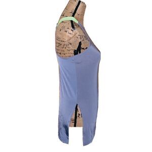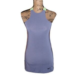 This Nike Dri-Fit racerback tank top is the perfect addition to your activewear collection. Made for women in size XS, the solid gray color with green accents and pullover closure make it easy to pair with any workout outfit. The sleeveless design racerback strap type and side slits, allow for maximum comfort and flexibility during your workout.