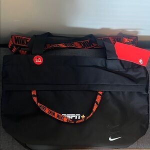 NWT Nike duffel bag in sleek black with bold red ESPN details. Features durable straps and modern design. Can fit a 15" laptop.