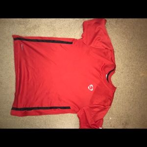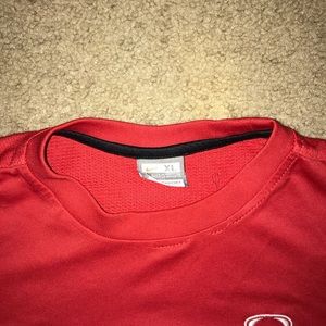 Red NikeFIT soccer shirt. XL Boy size. Fairly good condition. Has some loose threads around the collar as shown in pictures. Slight stain on the lower left side, but barely noticeable.