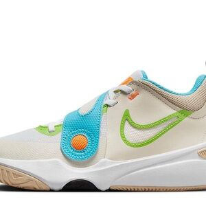 Stylish Nike sneakers for kids. Features blue and green accents. Perfect for basketball season! Only worn indoors twice