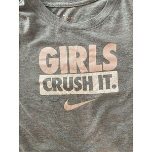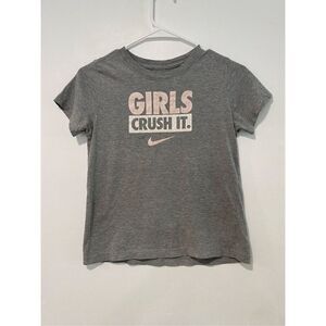 Adorable and motivational Nike graphic tee for girls! Features the slogan “Girls Crush It” in soft pink lettering on heather gray fabric. Size Medium (Youth). Gently used with plenty of wear left. Perfect for school, sports, or casual wear!