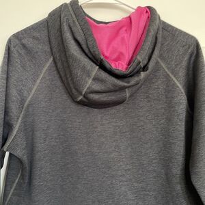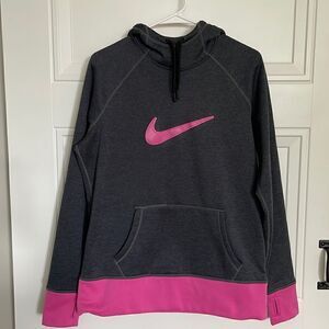 EUC- great sweatshirt with pink hem, hood lining, swoosh and cuffs. The cuffs have thumb holes. It’s a warm fleece lined hoodie.