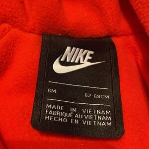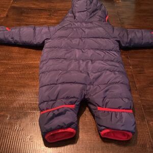 Warm Nike snowsuit for infants. Blue exterior with red lining and accents. Hooded design with front zipper.