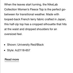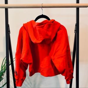 Coolest fleece top! A rich sporty red with black/white accents. Cropped and relaxed fit. I personally wore it zipped down with a sports bra! Perfect condition, worn once only.