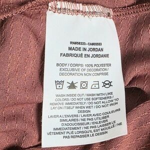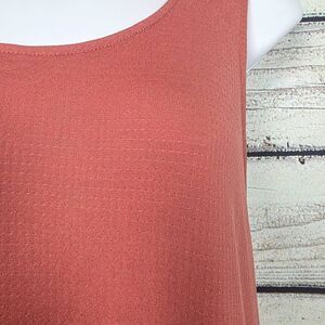 Nike women’s medium Dri-FIT racerback tank in a trendy rust orange hue. Features scoop neck, flowy fit, and moisture-wicking fabric for breathability. Made from 100% polyester for lightweight comfort and performance. Ideal for yoga, running, or gym sessions.