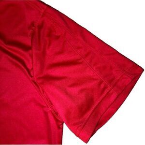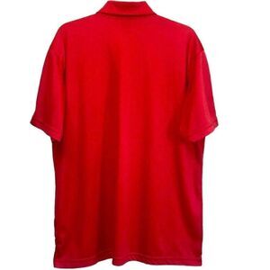 This bright red performance polo has nice sleeve detailing. It is made of a moisture wicking polyester. In excellent used condition.