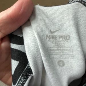 Nike Pro gray, black and white full length leggings in size small. No flaws. Polyester 88%, spandex 12%, machine wash. Inseam 28.5 inches. Great for fitness, relaxing after a crazy week or popping out to run errands. Super comfy.