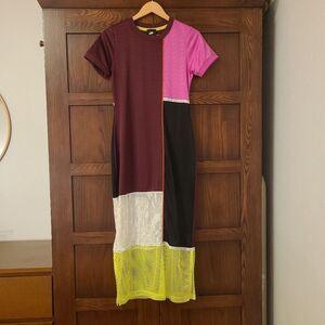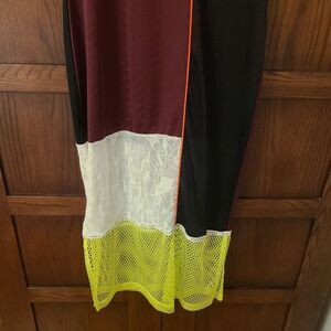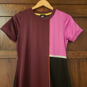 Sporty meets feminine with the Nike Sportswear Bordeaux Dress. A classic long dress silhouette gets an upgrade with a predominantly bordeaux and black color scheme. The yellow bottom is a mesh translucent material, with "NIKE SPORTS" repeated across the trim.