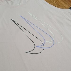 Color is light gray with multicolor Nike Swoosh Logos in black, blue and white.