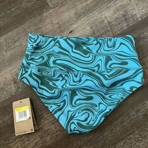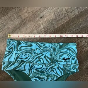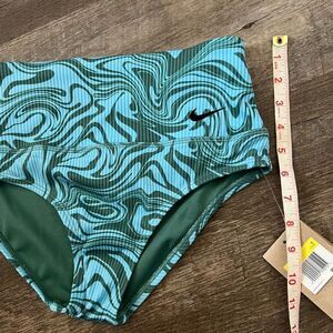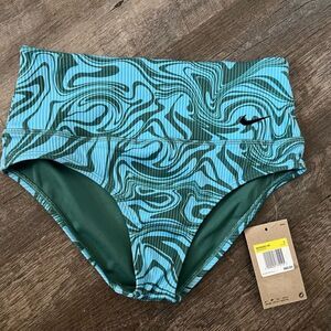 This listing is for a NWT's Nike Swirl High Waist Bottom in aquarius blue, in size small. Give your poolside OOTD a vintage summer twist with this retro design inspired by the movement of water and waves.
