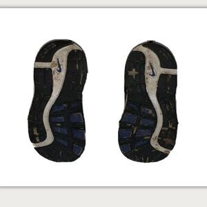 The Nike T-Run 2 ALT toddler running shoe provides stability for little kids learning to walk. The sneaker is lightweight with soft mesh and fabric materials, while the rubber outsole is sturdy with durable traction. Instead of laces, black and white striped straps crisscross the midfoot, providing a secure fit. Royal blue accenting on the Swoosh, branding, heel, and outsole that make the shoe pop. Slight wear but in overall good condition