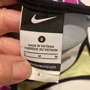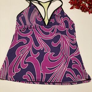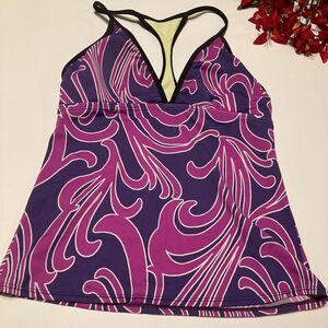 Nike V-Neck Raceback Tankini Size 8 13 1/2” across under arm 80% nylon/20% spandex dark purple and pink Good condition!