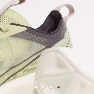 The shoe features an open mesh upper with a transparent textile window, as well as decorative zigzag stitching around the eye stays.