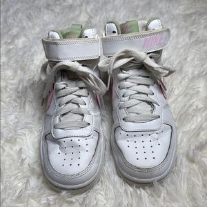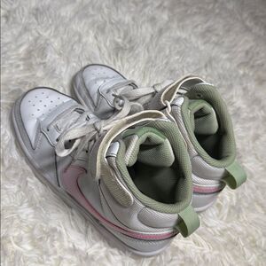 Nike high-top sneakers in white with pink swoosh and green details. Lace-up design with ankle strap.