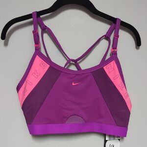Stylish and supportive sports bra by Nike. Features bold purple and pink design. Ideal for active wear.