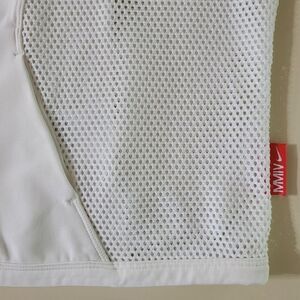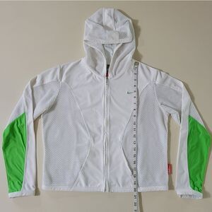 Nike Women's White Dri-FIT Mesh Hoodie is a stretchy, lightweight design that keeps you running in wet and dry weather. This hoodie has your favorite features- stretch fabric and mesh for ventilation. Zip up and and run in featherweight comfort. Ready for rain or shine! (Last photo shows small blue dot on back of right sleeve). Other than dot, jacket is in very nice condition!