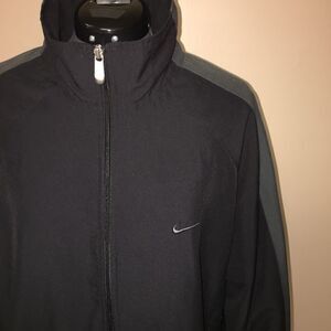 Nike full zip jacket. Lined with mesh. Flap on back. Good weight and quality. Not a slick fabric like a tracksuit. Drawstring bottom. Very good condition.